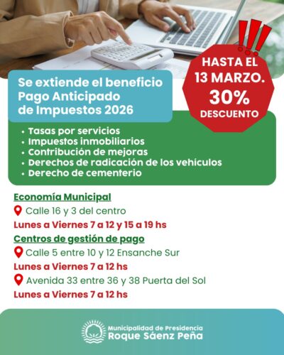 Se extiende el plazo para acceder al 30% de descuento en pago anticipado de impuestos 2026 Con el objetivo de que todos los contribuyentes puedan ponerse al día con el pago de...Leer más Actualidad