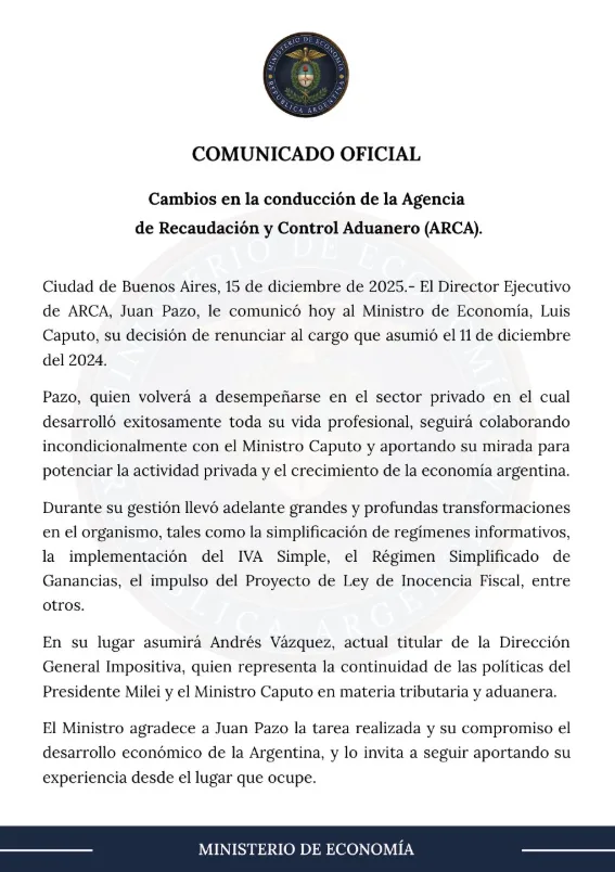 Juan Alberto Pazo renunció al cargo de director ejecutivo de la Agencia de Recaudación y Control Aduanero (ARCA y en su lugar fue designado Andrés Vázquez, quien se venía desempeñando como director general de la Dirección General Impositiva del Organismo.